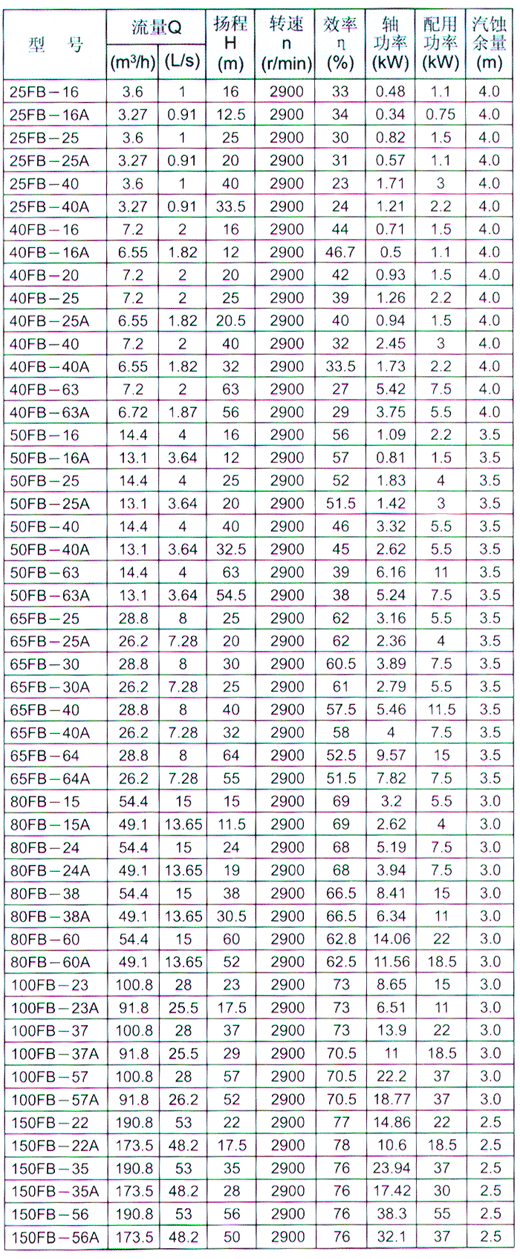 FB型泵适用于不含有固体颗粒介质,介质温度为0℃~120℃,进口压力不大于2kg/cm2。