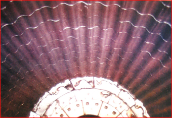 该衬板结构在各电厂使用年代较长,其特点是因比较原始,容易接受,其缺点是因周向力靠拧紧楔拧紧,所以拧紧楔上的螺栓易断导致波衬脱落和漏粉。